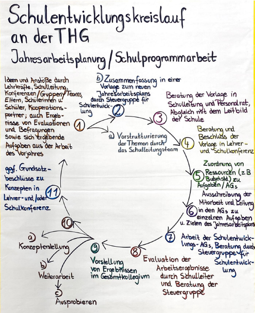 Natürlich bildet der Kreislauf den Idealzustand ab. Jetzt im zweiten Durchgang sind wir so weit, um im Kollegium genauer zu besprechen, welche Strukturen es dafür eigentlich braucht. Das Schulleitungsteam arbeitet dabei eng mit der Steuerungsgruppe für Schulentwicklung zusammen. Sie besteht aus vier Personen, die im Schuljahresverlauf ihr Augenmerk auf unterschiedliche Entwicklungsbereiche legen. Damit bildet die Steuergruppe eine Schnittstelle zu den einzelnen Schulentwicklungs-AGs, von denen wir momentan zehn haben.