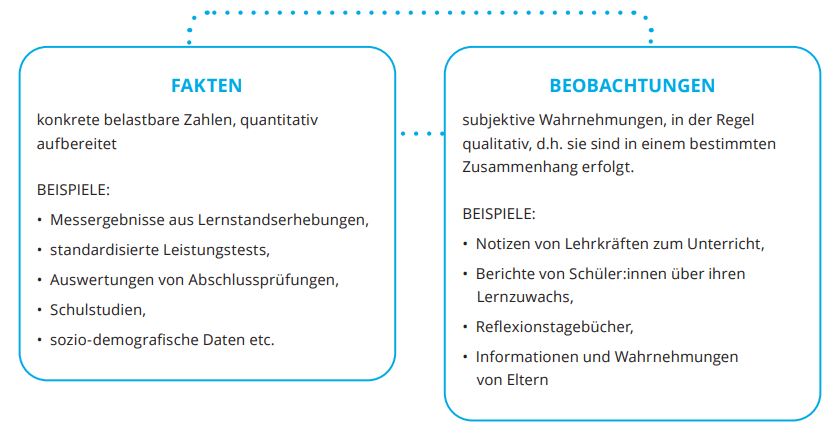 Daten sind keine Kontrollinstrumente. Es geht nicht um die Beurteilung von Personen, sondern um die Qualität von Maßnahmen, Prozessen und Entwicklungen. Sie ermöglichen einen Blick auf verschiedene Ebenen: die Schulebene, die Klassenebene und die Ebene der Schüler:innen. Sie können außerdem aus unterschiedlichen Quellen kommen, z. B. aus (länderübergreifenden) Studien, aber auch von Schüler:innen und deren Eltern. Daten helfen dabei, eine Bestandsaufnahme zu machen, den Ist-Stand zu reflektieren und einen Dialog sowie Verbesserungen anzustoßen. Sie sollten nicht allein, sondern gemeinsam interpretiert werden, beispielsweise in professionellen Lerngemeinschaften oder multiprofessionellen Teams. Daten allein machen jedoch noch keine Schulentwicklung. Vielmehr geht es darum, sich mit den erhobenen Daten auseinanderzusetzen, aus ihnen Informationen zu ziehen und anschließend in Wissen zu übertragen. Erst dann können Erkenntnisse für die Schul- und Unterrichtsentwicklung abgeleitet werden (vgl. Klopsch/Sliwka 2020, S. 65).