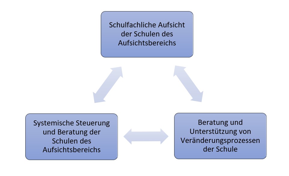 Nach wie vor hat die Schulaufsicht aus ihrem traditionellen Verantwortungsbereich heraus Führung wahrzunehmen, und beaufsichtigt aus schulfachlicher Perspektive die Schulen ihres Aufsichtsbereiches. Gleichzeitig übernimmt die Schulaufsicht aber immer stärker die Rolle des schulfachlichen Beraters. Sie berät, begleitet und unterstützt unter Berücksichtigung der strukturellen, organisatorischen und personellen Rahmenbedingungen Entwicklungs- und Veränderungsprozesse der einzelnen Schule. Sie berät und steuert aus der Perspektive der systemischen Organisationsberatung Entwicklungs- und Veränderungsprozesse aller Schulen des jeweiligen Aufsichtsbereichs.