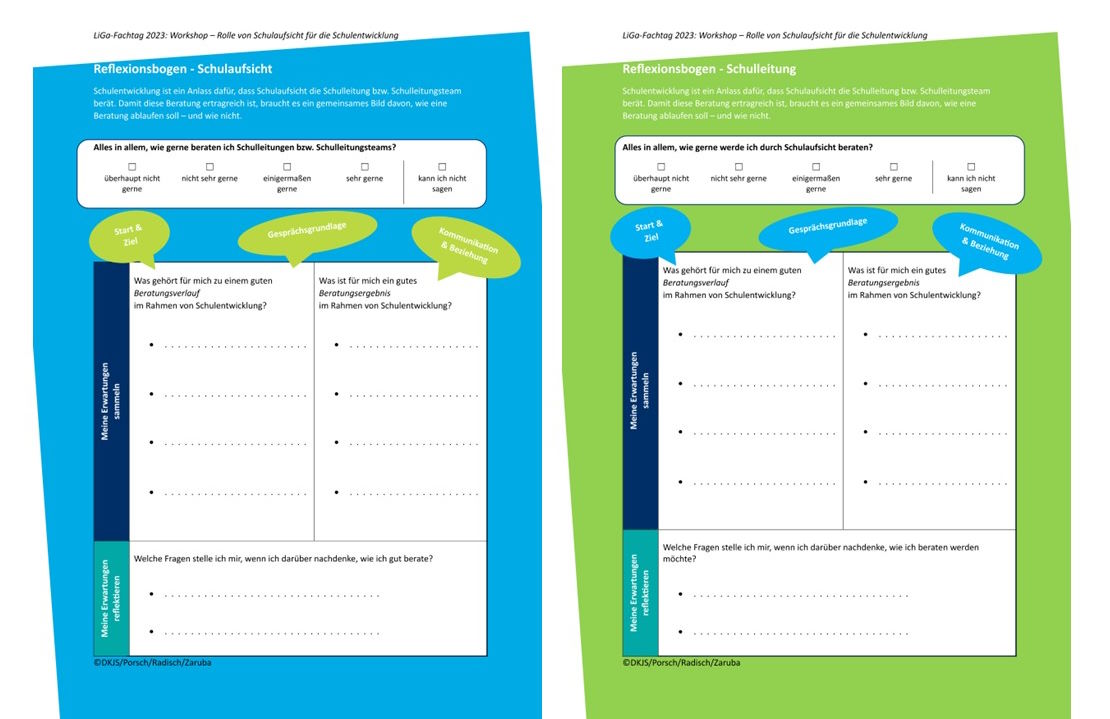 Aus Sicht der Referent:innen ist es für eine erfolgreiche Beratung hilfreich, wenn Schulaufsicht (SA) und Schulleitung (SL) ein gemeinsames Bild davon haben, wie eine Beratung zur Schulentwicklung ablaufen soll und wie nicht. Mithilfe von Reflexionsbögen gaben sie den Teilnehmenden hilfreiche Fragen an die Hand, um die Erwartungen beider Rollen zu sammeln und zu reflektieren:
